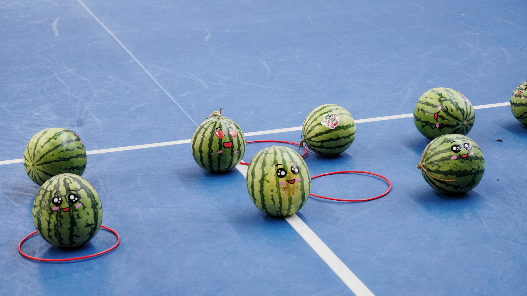 “進(jìn)擊吧西瓜”環(huán)節(jié)中,大家化身“西瓜勇士”,奮力投擲,隨著手中“西瓜球”破空而出,擊倒地面上瓶子,場(chǎng)上歡呼聲彌漫著收獲勝利的喜悅。