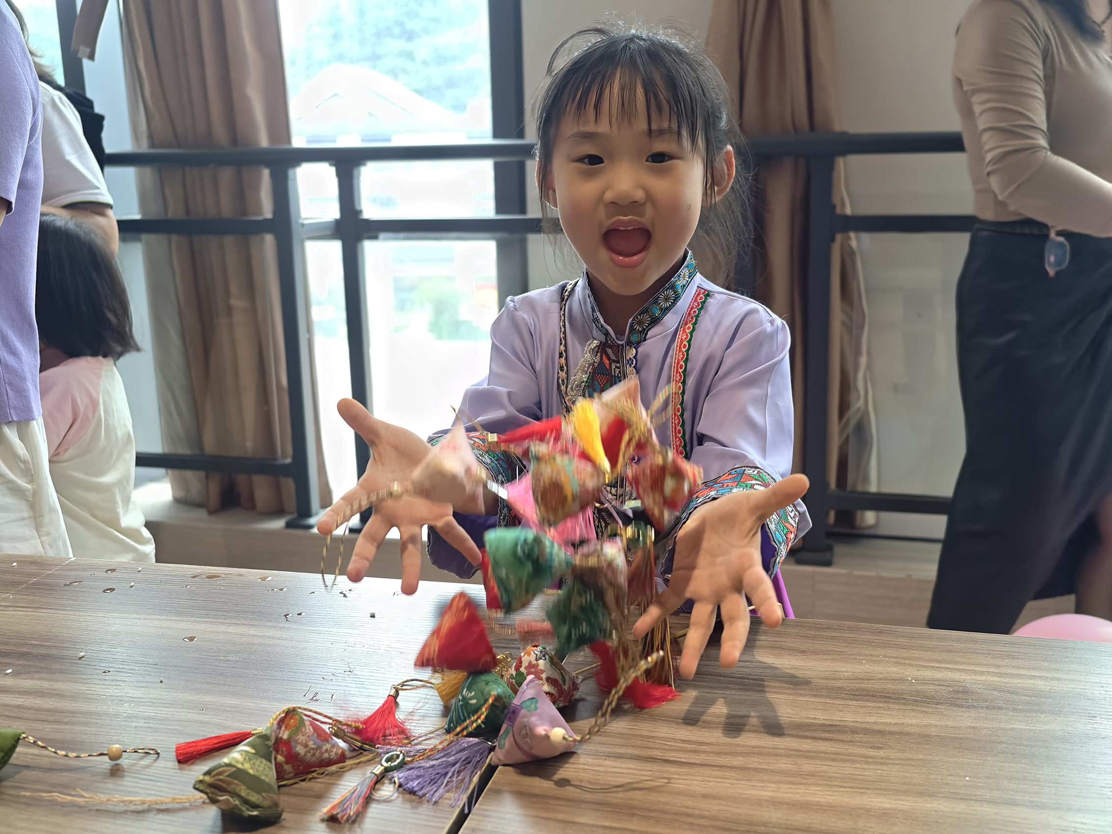 游戲環(huán)節(jié)結(jié)束后,大家開(kāi)始包粽子、做香囊,孩子們圍著長(zhǎng)桌,小手笨拙又興奮地學(xué)著大人的模樣包粽子、做香囊,翠綠寬大的粽葉在他們手中顯得有些調(diào)皮,不是卷不成錐形,就是裹不緊邊角。另一邊的角落,則是五彩斑斕的香囊世界,孩子們圍坐在一起,桌上鋪滿(mǎn)了色彩鮮艷的綢布、五彩絲線(xiàn)、亮晶晶的小珠子,還有散發(fā)著濃郁草藥香氣的艾草和菖蒲碎。他們用小手仔細(xì)地挑選著心儀的布料,小心翼翼地裁剪成小小的口袋形狀。穿針引線(xiàn)對(duì)他們來(lái)說(shuō)是個(gè)不小的挑戰(zhàn),小眉頭微微蹙起,線(xiàn)頭有時(shí)會(huì)調(diào)皮地打結(jié),但他們依然樂(lè)此不疲。通過(guò)包粽子、做香囊使孩子們深入了解中國(guó)各民族在端午節(jié)的悠久歷史和豐富的非遺傳承文化,感受到傳統(tǒng)文化的獨(dú)特魅力。
